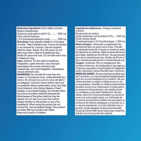 Active Ingredients: Anhydrous Citric Acid (1000 mg), Antacid; Sodium Bicarbonate (Heat-Treated) (1650 mg), Antacid. Inactive Ingredients: Aspartame, Flavor, Magnesium Stearate, Mannitol.