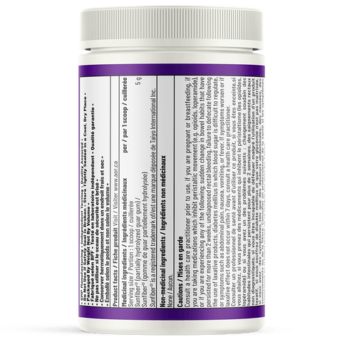 Solufibre contains Sunfiber, a soluble fibre derived from guar gum. Sunfiber has been shown to support gastrointestinal health. AOR’s SoluFibre contains partially hydrolyzed guar gum, a highly soluble, easy to take, digestion resistant form of fibre that imparts no flavor or texture change to the foods it’s added to. It has been studied in clinical trials, it has been found to have the greatest range of beneficial results and health applications, and it has been found to be the most tolerable form of fibre for children due to its lack of flavour and texture-changing characteristics.*