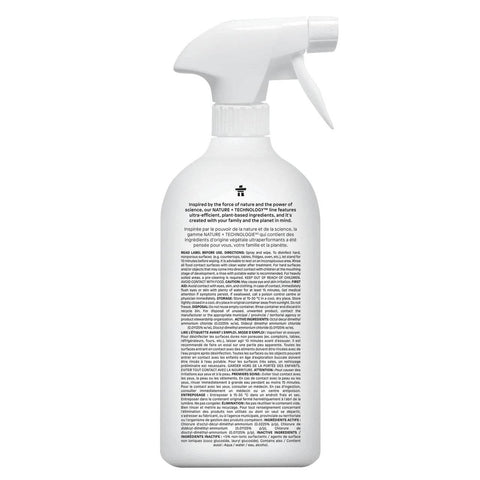 READ LABEL BEFORE USE. DIRECTIONS: Spray and wipe. To disinfect hard, nonporous surfaces (e.g. countertops, tables, fridges, oven, etc.), let stand for 10 minutes before wiping. It is advisable to test on an inconspicuous area. Rinse all food contact surfaces with clean water after treatment. For hard surfaces and/or objects that may come into direct contact with children at the mouthing stage of development, a rinse with potable water is recommended. For heavily soiled areas, a pre-cleaning is required.