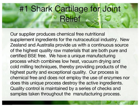 Unlike other companies that deodorize shark cartilage, which can significantly reduce its effectiveness, our Joint Relief product is formulated using a unique process that preserves its active ingredients. It is non-irradiated and no chemicals or enzymes are used in the production process.*