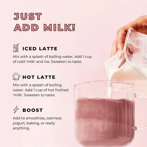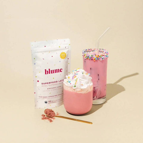 HOT LATTE: Mix 2 tsps of the Blume powder with a splash of boiling water. Sweeten to taste (we like maple syrup). Top with your favourite warm, frothed mylk and enjoy!