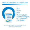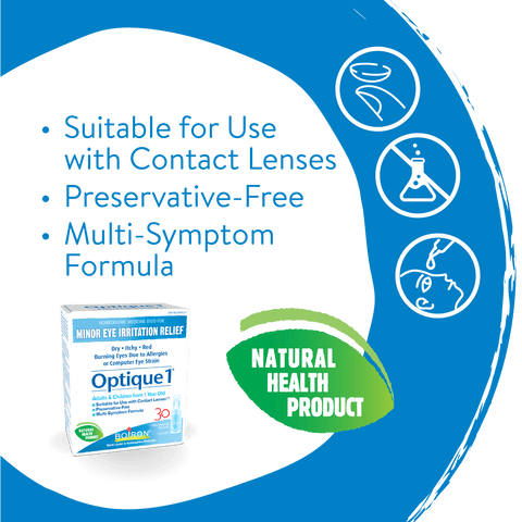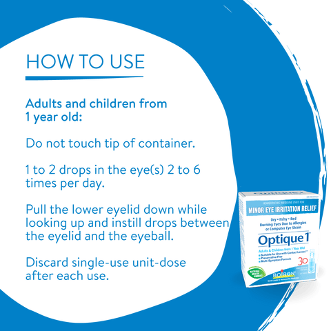 Boiron Minor Eye Irritation Relief Optique1 is a homeopathic medicine used to relieve minor eye irritations such as dryness, burning sensation, redness or itching due to allergies or pollution (ragweed, pollens, dust, smoke), strain, sustained visual efforts (computer, reading) or swimming.*