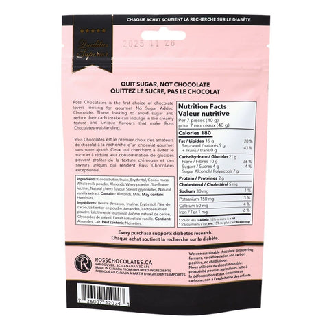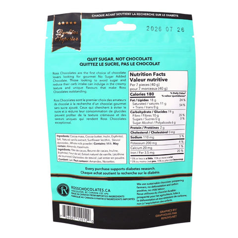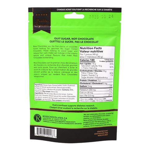 Almond Butter: Organic dark chocolate (organic cocoa mass, organic cane sugar, organic cocoa butter, organic vanilla extract), Organic almond butter (organic almonds, organic palm oil, organic cane sugar, sea salt), Organic white chocolate (organic sugar, organic cocoa butter, organic whole milk powder, organic soy lecithin, organic vanilla).