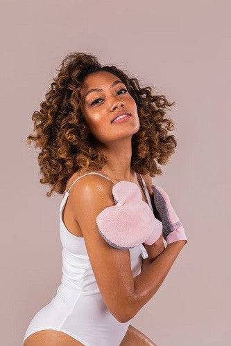 Perfect for the shower or the bath — just slide your hands into the gloves, use the grey side to exfoliate, then rotate to the pink side to lather up!