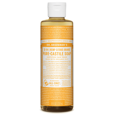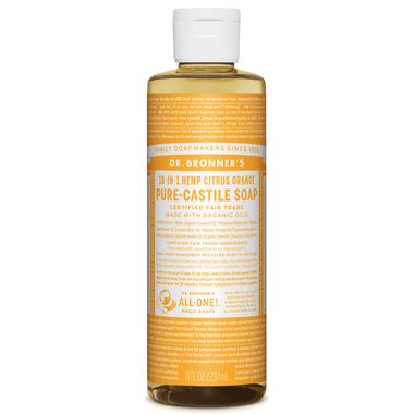 Fresh and bright & with an invigorating blend of organic orange, lemon and lime oils! Dr. Bronner's Citrus Pure-Castile Liquid Soap is concentrated, biodegradable, versatile and effective. Made with organic and certified fair trade ingredients, packaged in a 100% post-consumer recycled bottle. All-One!