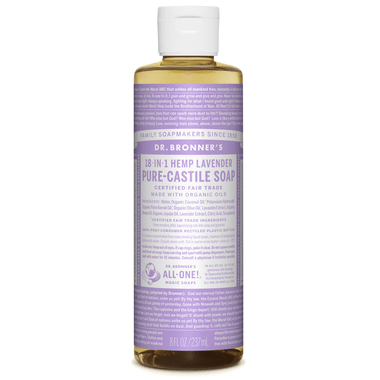 Scented with pure lavender and lavandin oils to calm the mind and soothe the body! Dr. Bronner's Pure-Castile Lavender Liquid Soap is concentrated, biodegradable, versatile and effective. Made with organic and certified fair trade ingredients. Organic hemp oil is now sourced in the U.S. following hemp legalization! Packaged in a 100% post-consumer recycled bottle. All-One!*