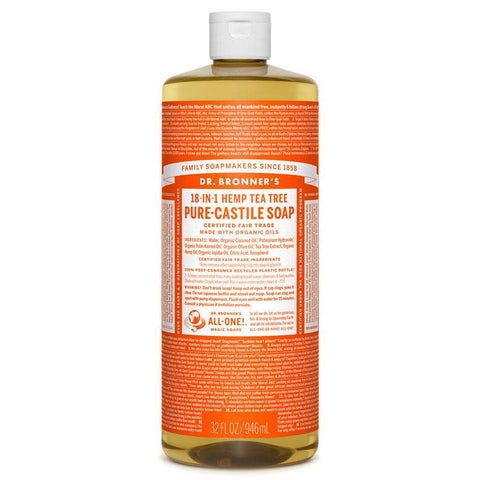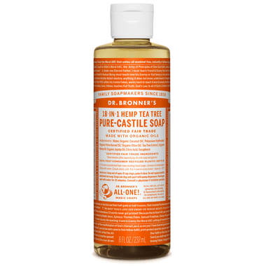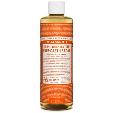 Dr. Bronner's Pure-Castile Tea Tree Oil Soaps are good for just about any cleaning task. Face, body, hair, food, dishes, laundry, mopping, pets, they clean your house and body with no synthetic preservatives, detergents or foaming agents.