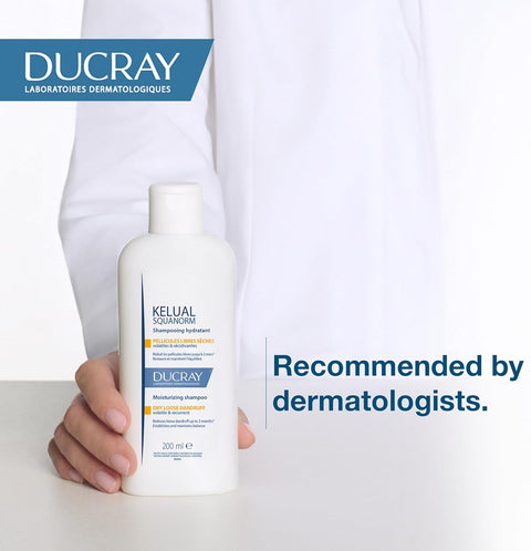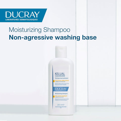 Ducray Kelual Squanorm Shampoo: Eliminate Dry Dandruff & Hydrate Your Scalp. Say goodbye to dry, loose dandruff with Ducray Kelual Squanorm Moisturizing Shampoo. This innovative, probiotic science formula gently eliminates 100% of visible dandruff from the first wash, hydrates your scalp, and prevents recurrence for up to two months. Experience a healthy, comfortable scalp and soft, shiny hair.