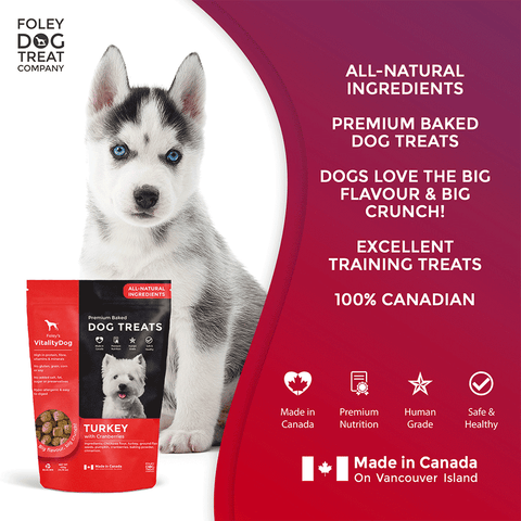 Indulge your furry friend with Foley's Vitality Dog Treats! Packed with protein-rich turkey, these treats support strong muscles and a healthy coat. The addition of antioxidant-packed cranberries helps boost your dog's immune system while providing a delicious flavour. Grain-free and gluten-free, they're perfect for sensitive stomachs. Watch your pup's tail wag with delight as they savour the irresistible flavour of these all-natural, preservative-free treats.