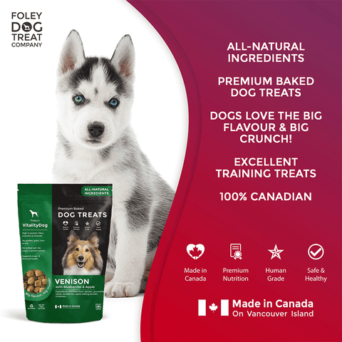 Indulge your furry friend with Foley's Vitality Dog Treats! These treats are crafted with real venison, blueberries, and apples and offer a delightful and nutritious snack. Packed with protein and antioxidants, they support your dog's overall health and well-being. The irresistible taste and chewy texture will keep your pup returning for more. Plus, these treats are grain-free, gluten-free, and made with natural ingredients, ensuring a safe and enjoyable experience for your beloved companion. Treat your dog to the goodness of Foley's Vitality Dog Treats today.