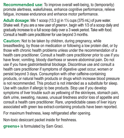 A: Greens+ Extra Energy contains natural sources of caffeine from yerba maté and green tea. If you're sensitive to caffeine, consider starting with a smaller serving to assess tolerance.