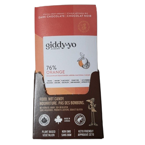 Indulge in the vibrant fusion of Giddy Yo Orange 76% Certified Organic Dark Chocolate Bars. This isn't just a chocolate bar; it's a burst of sunshine in every bite! Imagine the rich, smooth 76% dark chocolate melting on your tongue, followed by the bright, tangy zest of real orange. It's like a citrusy symphony for your taste buds! And the best part? It's organic, vegan, soy-free, non-GMO, fair trade, dairy-free, gluten-free, and plant-based! So, whether you're a health-conscious foodie or a chocolate aficionado seeking a delightful twist, Giddy Yo has you covered.