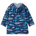 The coat features a front snap closure and an inside hanging loop, making it easy to get on and off. The sharks swimming across the navy blue fabric will make your child feel like they're part of a school of sharks ready to take on the storm.