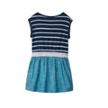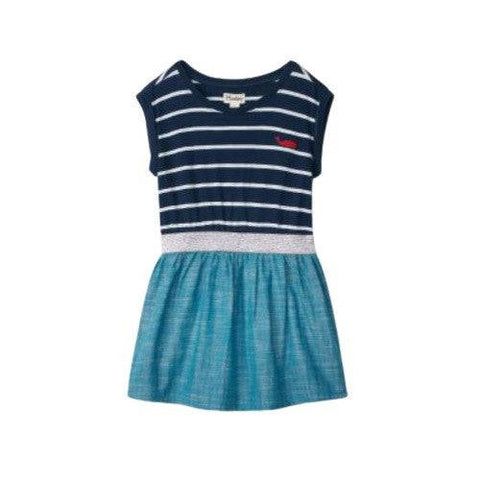 Dress them at a party dress like no other. Made with dolman sleeves and a chambray lower skirt, this super unique dress features a sweet nautical stripes print that they will adore!