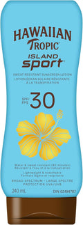 The Hawaiian Tropic Island Sport Sweat Resistant Sunscreen Lotion SPF 30 has been tested by skin doctors. The lotion has the classic tropical smell that Hawaiian Tropic products are known for. It contains specific botanicals inspired by the islands, which add to the product's appealing scent. This bottle contains 240mL of the lotion, making it a great size for your beach bag or gym locker.