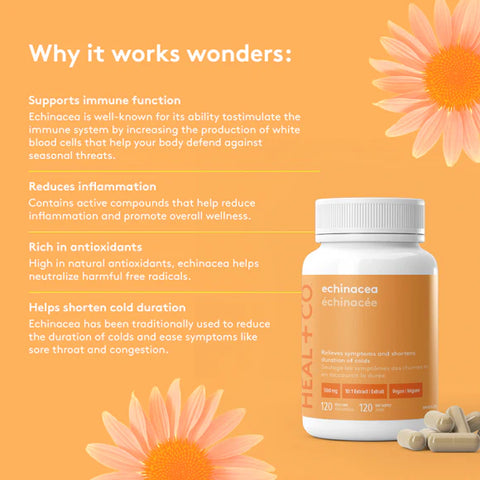 A: HEAL + CO Echinacea relieves common cold and flu symptoms and offers potent antioxidant support. Its 10:1 extract and 4% polyphenol standardization ensure a high-quality and effective supplement.