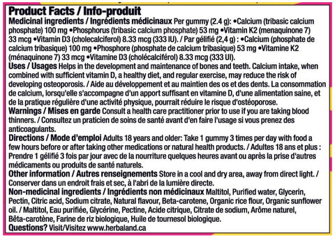 Herbaland Calcium Plus Gummies are your delicious and convenient solution! These chewable gummies provide a boost of calcium, essential for the development and maintenance of bones and teeth. Think of calcium as the foundation of your skeletal structure – it's what keeps you strong and active. Each bottle contains 60 gummies, making it easy to incorporate this vital nutrient into your daily routine. These gummies aren't just good for you, they taste great too, making taking your vitamins a treat, not a chore! Why wait until your bones start to weaken? Start nourishing them today with Herbaland Calcium Plus Gummies! These gummies go beyond simply providing calcium. They also contribute to overall health and well-being. Adequate calcium intake, sufficient vitamin D, a healthy diet, and regular exercise may reduce the risk of developing osteoporosis.