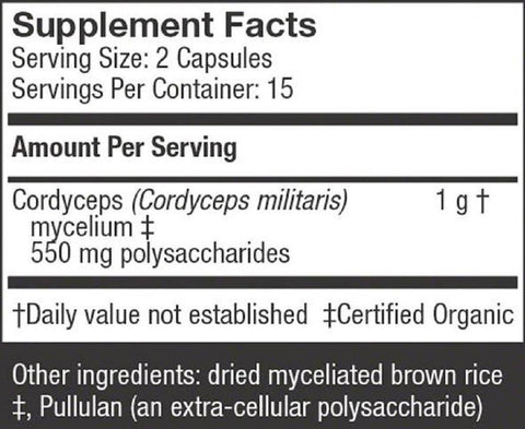 Host Defense® Cordyceps Capsules use activated, freeze-dried, Certified Organic mycelium, with a full spectrum of constituents: polysaccharides (beta glucans, arabinoxylane, glucose, xylose, galactose and cordycepic acid), glycoproteins, ergosterols, triterpenoids and other myco-nutrients, which are essential for Supporting Natural Immunity.*