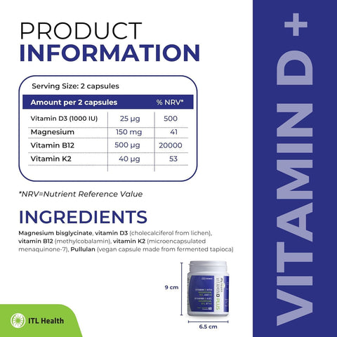 ITL Health Vitamin D Plus With Magnesium Vitamin B12 and Vitamin K2 60 Capsules