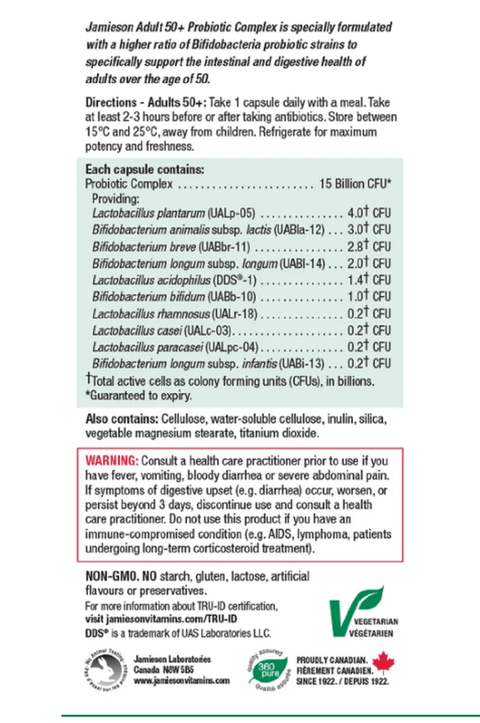 Jamieson Adult 50+ Probiotic Complex helps with intestinal and gastrointestinal health, and contains 10 unique probiotic strains that have been identified by research to support the digestive health of adults over 50. Jamieson's new advanced tube technology provides protection from moisture to guarantee potency and freshness, so you know you will get 15 billion active cells in each vegetarian capsule until expiry."