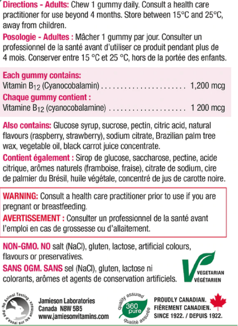 Jamieson Gummies B12 1200 mcg Raspberry Flavor 70 Vegetarian Gummies