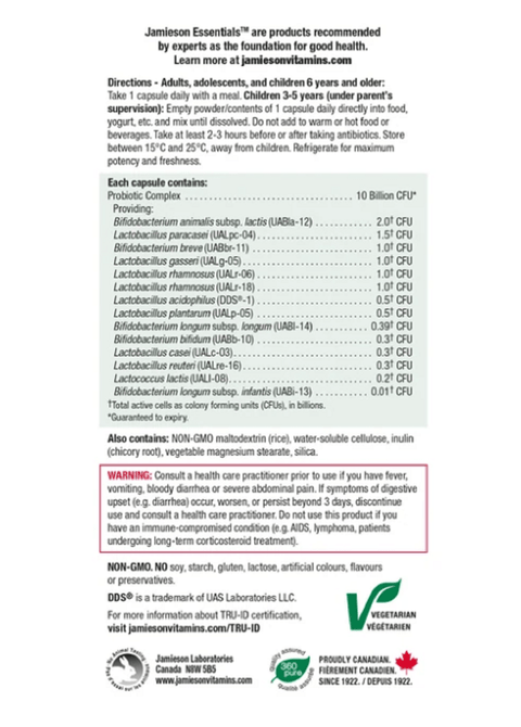 Jamieson Probiotics are formulated using unique probiotic stains to support digestive health. Jamieson Probiotics are packaged to provide protection from moisture in order to guarantee potency and freshness, so you know you will receive all the active cells in each vegetarian capsule until expiry."