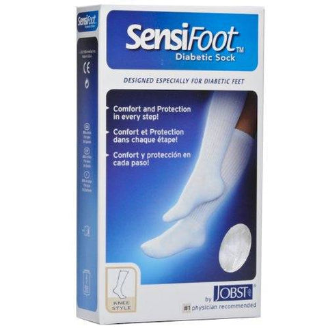 Jobst Sensifoot Diabetic Knee-High Compression Socks have over the calf style for people who experience decreased nerve sensation caused by diabetes or foot pain from arthritis.* The mild non-constricting gradient pressure prevents sliding, bunching or wrinkles.* They feature dense padding in the foot, heel and toe to reduce friction and provide cushioning for extra comfort.*