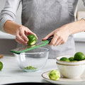 Fine Paddle Grater, with bowl grip, green, 26.5, stainless steel. Designed for for grating into bowls with ease and stability. Hooks onto edge of bowl for a mess-free collection of grated food. Sharp stainless-steel blade. Easy-grip handle with non-slip tip.