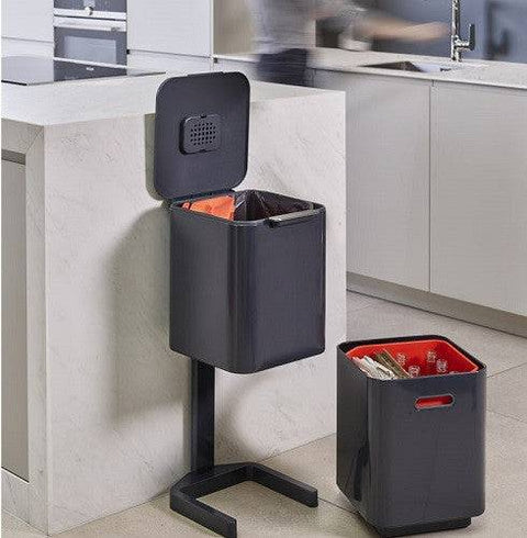 Compact Waste Bin, 40L capacity, graphite colour. TOTEM, a flexible system that encourages waste separation, without taking up precious kitchen space. TOTEM features a 20-liter general waste compartment, large enough to accommodate waste from even the busiest kitchen. It also features a 20-liter recycling drawer compartment.