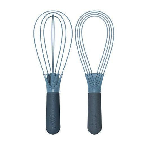 2-in-1 Silicone Whisk, 28cm, blue. Two styles of whisk in one: a flat whisk for blending sauces and gravies that transforms into a balloon whisk for whipping and mixing. Folds flat for compact storage.