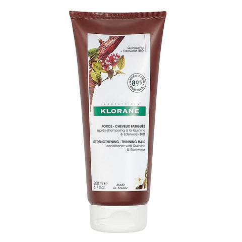 Klorane Quinine Conditioner: Strengthen & Detangle (400mL). Organic quinine and edelweiss fortify thinning hair, add volume, and reduce breakage. It is vegan, 89% natural, and silicone-free.