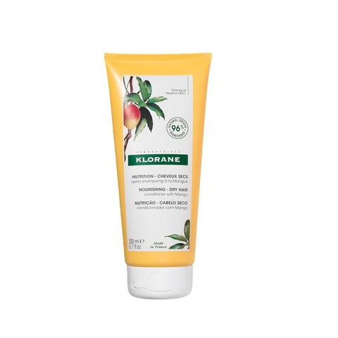 Klorane Mango Conditioner: Nourish & Detangle (200mL). Mango butter deeply nourishes dry hair, adds shine & detangles. 96% natural, family-friendly (3+), recyclable packaging.