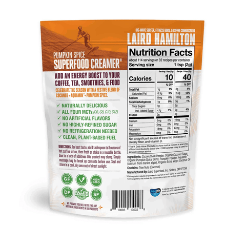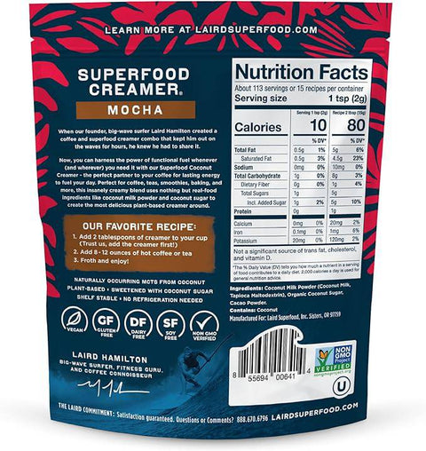 Laird Superfood Creamer Original is creafted from the highest quality all-natural whole food ingredients. It combines a unique blend of coconut milk powder and Aquamin (a sea algae that contains minerals such as calcium) with coconut oil.