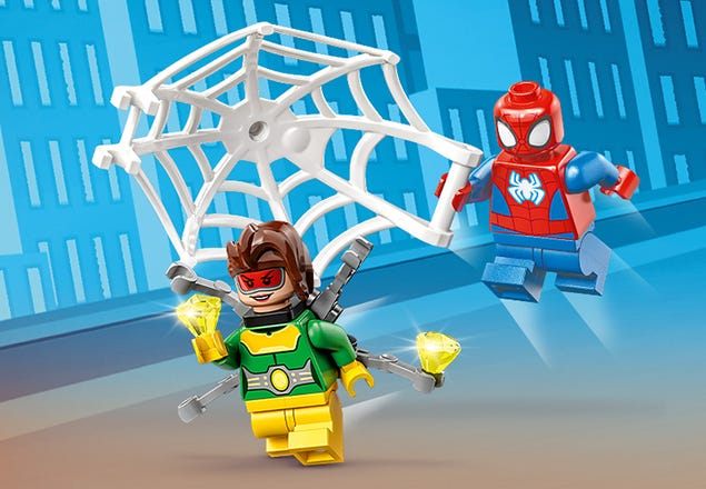 Doc Ock has stolen some diamonds. Spidey jumps into his supercool Spider-Man car and races after her. The car has glowing web on both sides, so Spidey can even drive in the dark. He slings a big web across to a lamppost. Will Doc Ock get caught in Spidey's trap or will she use her mechanical tentacles to climb free?
