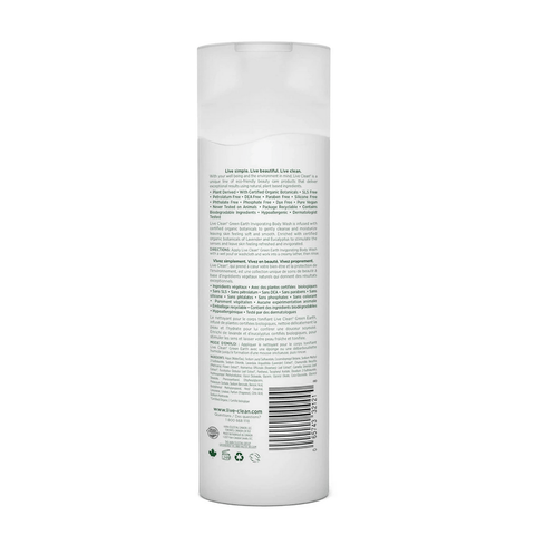 Live Clean Green Earth Invigorating Body Wash is infused with certified organic botanicals to gently cleanse and moisturize leaving skin feeling soft and smooth.* Enriched with certified organic botanicals of lavender and eucalyptus to stimulate senses and leave skin feeling refreshed and invigorated.* This body wash is 98% plant-based, made in Canada, vegan, never tested on animals, Leaping Bunny certified, sulfate and paraben free body wash.