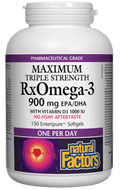 Natural Factors Maximum Triple Strength RxOmega-3 with Vitamin D3 is a high-potency form of omega-3 essential fatty acids in a convenient one-per-day softgel. Each dose provides an optimal 2:1 ratio of EPA to DHA that supports cardiovascular and cognitive health, brain function, and reduced symptoms of rheumatoid arthritis.