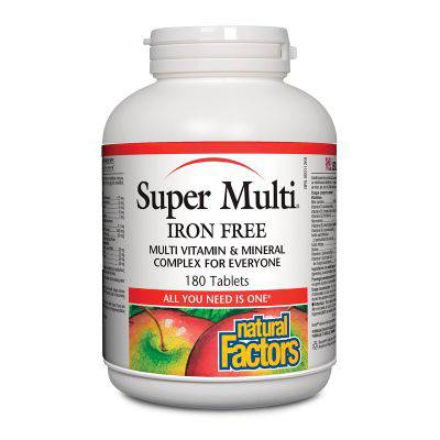 Natural Factors Super Multi Iron Free supplies a broad spectrum of vitamins, minerals, and synergistic antioxidants from citrus bioflavonoids, rutin, and hesperidin. This is an excellent medium strength one-per-day multivitamin/mineral tablet ideal for men, menopausal women, and others not requiring iron.*