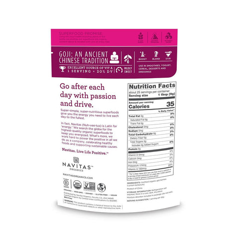 Easily boost your antioxidant intake with Navitas Organics Goji Berry Powder. A mild berry-tasting fruit powder, Navitas Organics Goji Powder is a great source of vitamins, particularly vitamin A (20% DV per serving). Navitas Organics Goji Berry Powder is ideal for blending into smoothies, stirring into yogurt or mixing into dessert batters.*