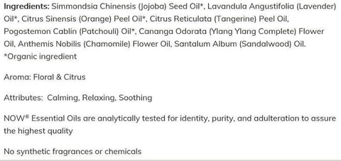 Simmondsia Chinensis (Jojoba) Seed Oil‚ Lavandula Angustifolia (Lavender) Oil‚ Citrus Sinensis (Orange) Peel Oil‚ Citrus Reticulata (Tangerine) Peel Oil‚ Pogostemon Cablin (Patchouli) Oil‚ Cananga Odorata (Ylang Ylang Complete) Flower Oil‚ Anthemis Nobilis (Chamomile) Flower Oil‚ Santalum Album (Sandalwood) Oil.