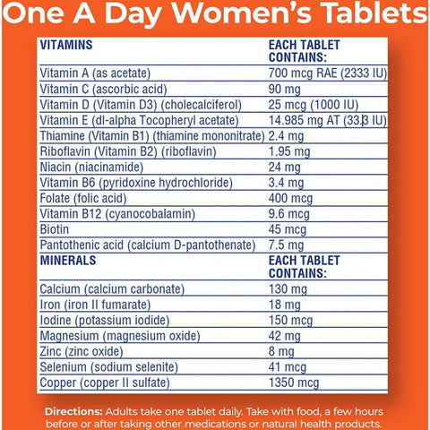 The unique formula of One A Day Women multivitamins supports bone, immunological, eye, skin, heart, and metabolism health! Daily nutritional support: One A Day Women Multivitamin Tablets are a multivitamin brand created for health-conscious women who might not be obtaining enough essential nutrients from their diet.
