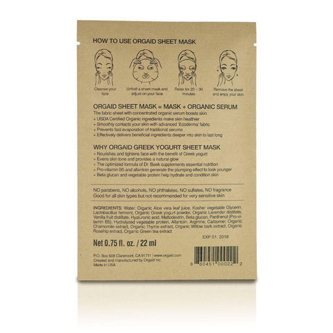 Orgaid Sitka Naturals Sheet Mask Variety Pack - 6 Pack contains 2 Anti-aging, 2 Greek Yougurt and 2 vitamin C & Revitalizing masks. They are specially formulated with Ecoderma fabric technology to allow the serum to absorb deeper into the skin.