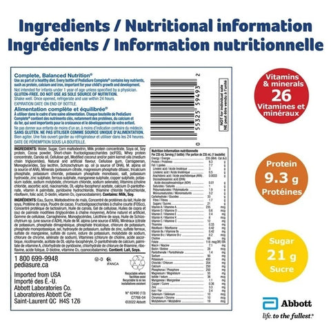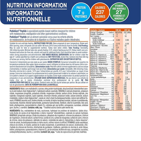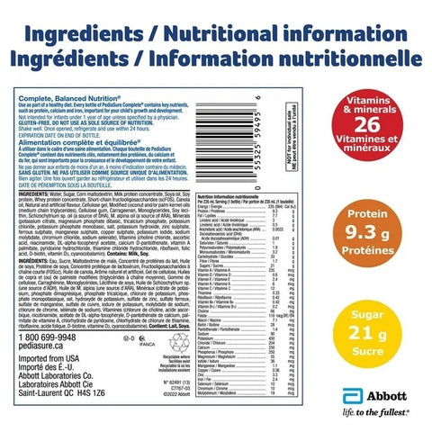 Water, corn maltodextrin, high oleic safflower oil, sodium caseinate, soy oil, sucrose, modified coconut and/or palm kernel oils (medium chain triglycerides), calcium caseinate, whey protein concentrate, potassium citrate, short-chain fructooligosaccharides, uncontaminated modified oat hulls, soy cotyledon fibre, natural and artificial flavours, calcium phosphate, magnesium chloride, gum arabic, potassium phosphate, monoglycerides, soy lecithin, sodium carboxymethyl cellulose, sodium citrate, choline chloride, sodium chloride, ascorbic acid, taurine, m-inositol, potassium chloride, ferrous sulphate, zinc sulphate, niacinamide, L-carnitine, dl-alpha- tocopheryl acetate, calcium d-pantothenate, cupric sulphate, citric acid, thiamine hydrochloride, pyridoxine hydrochloride, riboflavin, manganese sulphate, vitamin A palmitate, folic acid, biotin, potassium iodide, chromium chloride, sodium molybdate, phylloquinone, sodium selenate, vitamin D3, cyanocobalamin.