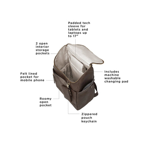 Petunia Pickle Bottom’s signature vegan leatherette fabrics are naturally water-resistant and can be cleaned with a damp cloth and mild detergent. They do not dry clean and are not machine washable. Insulated pockets have a water-proof thermal lining. This silver-coloured lining is easy to wipe down with a wet cloth and mild detergent.