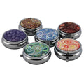 The Paisley Pill Box with push button flip top, sturdy hinge, a mirror is portable and keeps content safe.