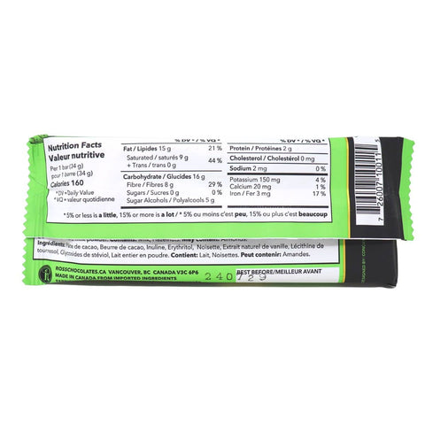 This decadent dark chocolate bar is packed with flavour but skips the sugar! Stevia, a natural sweetener, keeps it keto-friendly and perfect for those watching their sugar intake. Creamy dark chocolate is studded with crunchy hazelnuts for a delightful textural contrast in every bite. These individually wrapped bars are perfect for portion control, on-the-go snacking, or satisfying your sweet tooth without derailing your health goals.