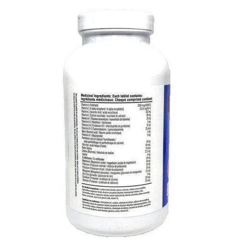 Vitamin A, B-Vitamins (B-1, B-2, B-3, B-6, B-12, niacin, pantothenic acid folic acid, biotin), vitamin C, vitamin D, vitamin E, choline, inositol, DL-methionine, L-cysteine, Calcium, Magnesium, Potassium, Manganese, Zinc, Chromium, Selenium, Silica, Glandular concentrates (Adrenal, Thymus, Spleen).
