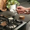 - A nonstick poaching insert that cooks one egg at a time, along with a stainless steel pan with a long comfortable handle, and lid.