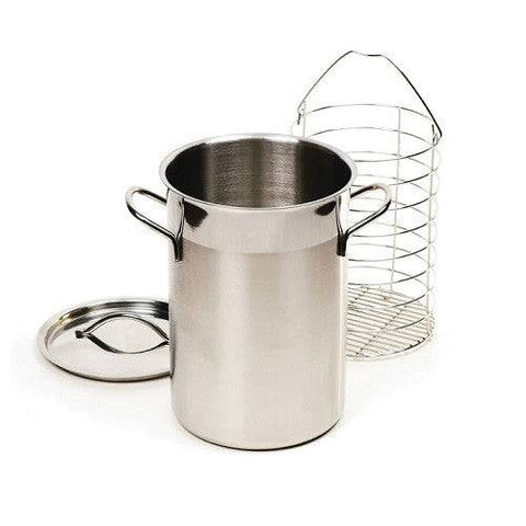 Perfectly steam your asparagus with this traditional style stainless steel steamer insert. This fabulous steamer features a chromed wire basket, allowing the asparagus stalks to stay upright while the delicate tips are gently steamed in boiling water. This steamer is also great for several ears of corn or even a few artichokes. Lid is stainless steel as well. A great addition to any kitchen.