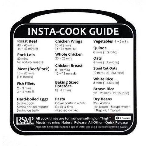 - Reference this guide for the proper times and ratios to cook your food for a perfectly instant-cooked meal every time.