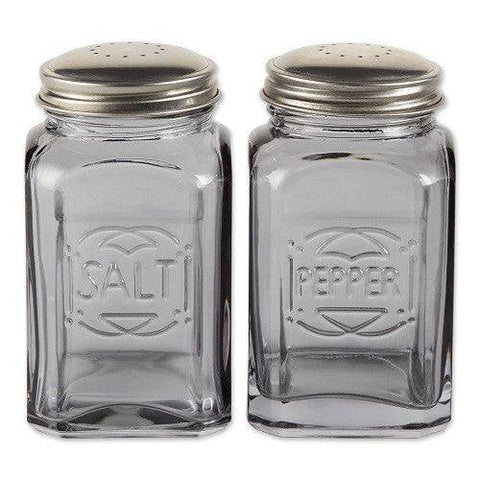 - Retro inspired glass shakers with stainless steel screw-on lids.